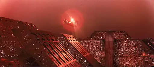 Технические спецэффекты, миниатюры и композиционные приёмы того времени стали визитной карточкой картины. В эпоху до цифровой обработки большинство визуальных трюков реализовывались «по-старинке»: через миниатюры, оптические комбинирования и трудоёмкие матовые живописи. Модели летательных аппаратов, так называемых spinner-автомобилей, создавались с тщательной деталировкой, а их полёты и приземления компоновались с помощью motion-control камер. Матовые картины и панорамные композиции расширяли ощущение города, создавая небоскрёбы и небесные перспективы, которых физически не было на площадке. Смесь практических эффектов, миниатюр и ретушей дала фильму удивительную целостность: мир выглядел ощутимым, а не цифровым, что сегодня играет ему на руку с точки зрения ретроспективного восприятия.