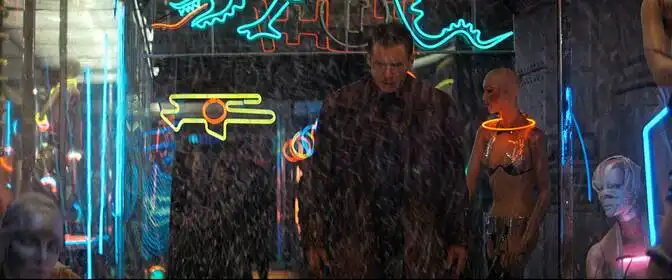 Кинематографические мелочи — реквизит, вывески, рекламные объявления на языке смешения культур — указывают на глобализированный мегаполис будущего и отсылают к реальным образцам городской среды. Японские и китайские иероглифы, неоновые вывески и мультикультурность улиц показывают влияние восточной эстетики на западный урбанизм и делают отсылку к постимперским картинкам мегаполисов, которые можно увидеть в неоновых пейзажах «Токио». Эти элементы служат не только визуальным фоном, но и комментариями о культурной гибридности будущего, где национальные границы растворяются в корпоративных интереcах и потребительской эстетике.