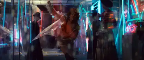 Сценография и дизайн — это та область, где стиль фильма особенно заметен. Каждый интерьер, каждая вывеска и каждая деталь одежды выполнены с тщательной проработкой, где технологичность соседствует с архаикой, а роскошь — с запущенностью. Костюмы и декорации отражают смешение культур: азиатские аллюзии соседствуют с европейским ретро, что создаёт ощущение глобализированной городской среды. Использование миниатюр, матовых картин и практических эффектов делает мир фильма материальным и осязаемым; все его поверхности обладают историей, они не чисты и стерильны, а изношены и запылены, что усиливает ощущение времени и жизни, прожитой в этом пространстве.